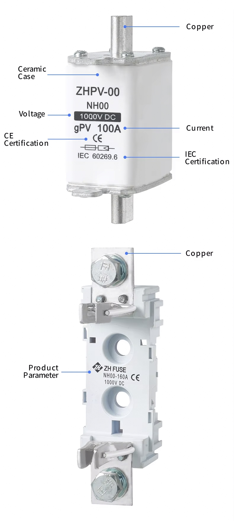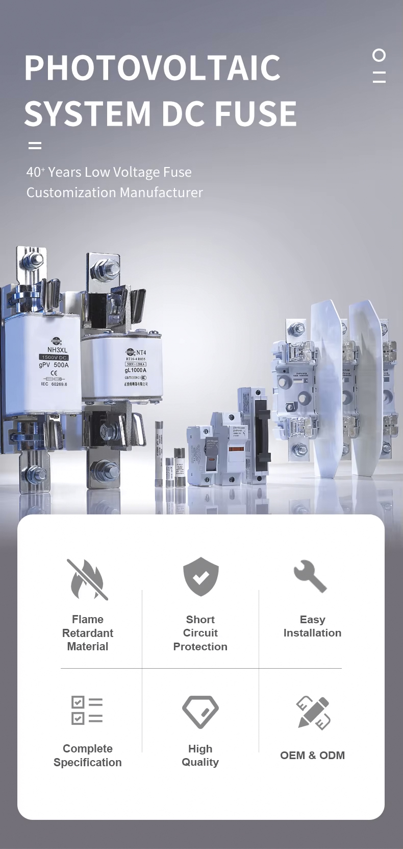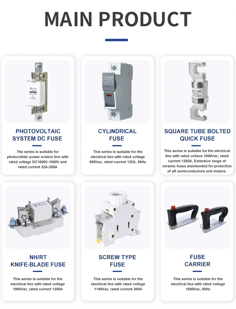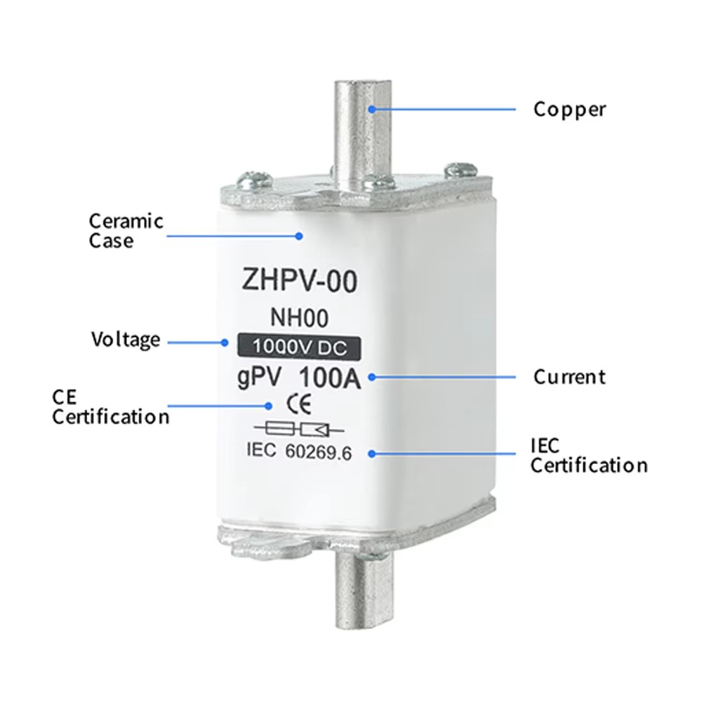 NH00 Photovoltaic System DC 1000V 32~100A Fuse Link ວັດສະດຸທີ່ມີຄຸນນະພາບສູງຖືກເລືອກເພື່ອຮັບປະກັນຄຸນລັກສະນະຟິວທີ່ໝັ້ນທ່ຽງ ແລະເຊື່ອຖືໄດ້, ຄວາມໄວຕອບສະໜອງໄວ ແລະຄວາມປອດໄພສູງ. ກະທັດຮັດໃນລັກສະນະ, ງ່າຍທີ່ຈະຕິດຕັ້ງ, ຖືກນໍາໃຊ້ຢ່າງກວ້າງຂວາງໃນລະບົບຕ່າງໆເຊັ່ນ: ກ່ອງປະສົມປະສານ photovoltaic, inverters, ແລະຕູ້ແຈກຢາຍ DC. NH00 Photovoltaic System DC 1000V 32 ~ 100A Fuse Link ໄດ້ຜ່ານການຢັ້ງຢືນສາກົນຫຼາຍອັນແລະປະຕິບັດຕາມມາດຕະຖານ IEC, ເຮັດໃຫ້ມັນເປັນທາງເລືອກທີ່ເຫມາະສົມສໍາລັບການຮັບປະກັນການດໍາເນີນງານທີ່ປອດໄພຂອງລະບົບໂຮງງານໄຟຟ້າ.