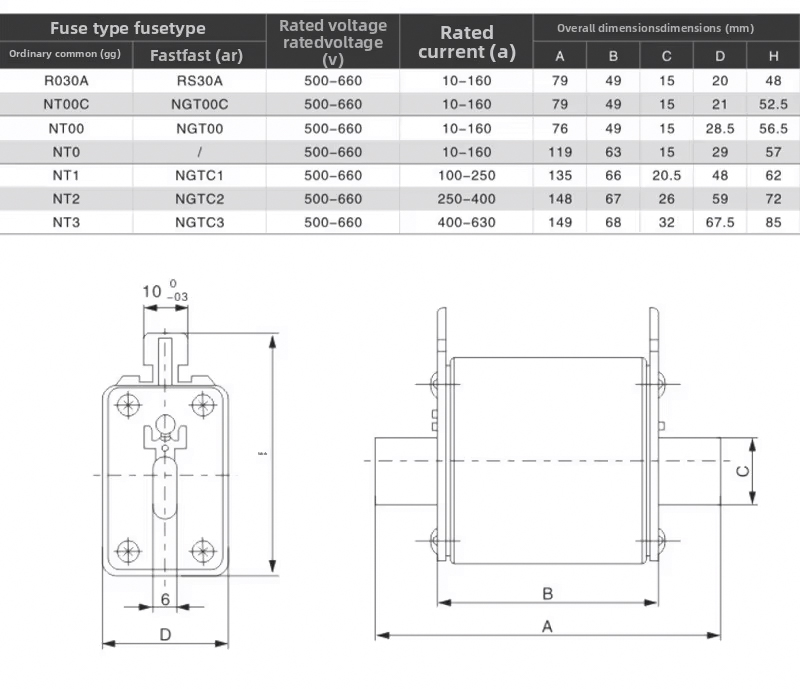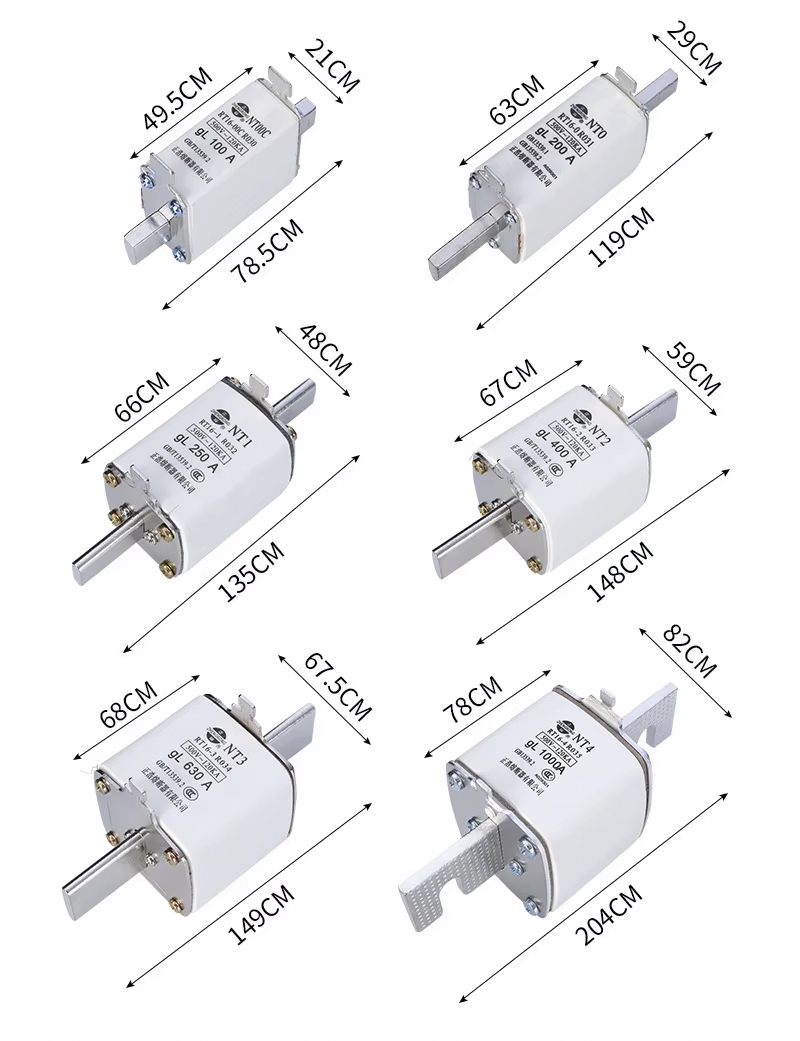 NT/NH Blade type fuse-links aM class ແມ່ນເພື່ອປ້ອງກັນ motor. fuse-links ທີ່ມີຄວາມອາດສາມາດແຕກຫັກສູງເຫຼົ່ານີ້ມີຈຸດປະສົງເພື່ອປ້ອງກັນວົງຈອນສັ້ນໃນມໍເຕີ, ຫມໍ້ແປງໄຟຟ້າແລະການໂຫຼດອື່ນໆທີ່ມີກະແສໄຟຟ້າແຮງດັນສູງ. ມີຕົວຊີ້ວັດສາຍຕາມາດຕະຖານຢູ່ດ້ານເທິງ, ແລະມີທາງເລືອກໃນດ້ານຫນ້າ. ຟິວຊຸດນີ້ປະກອບດ້ວຍຟິວຈາກຂະຫນາດ NH000 ເຖິງ NH4, ມີກະແສໄຟຟ້າສູງເຖິງ 1250A, ລະດັບແຮງດັນສູງເຖິງ 690V.